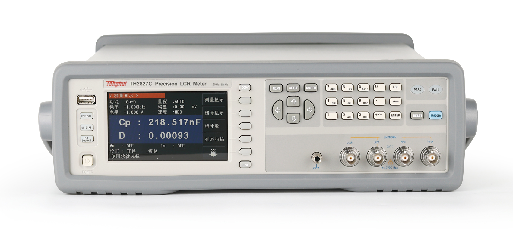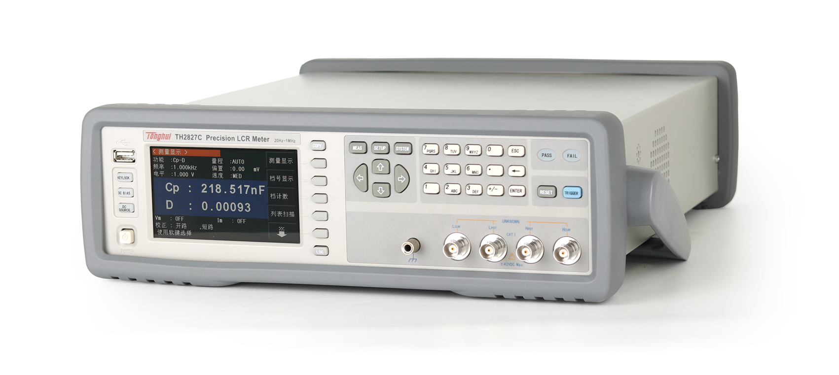 ■?TH2827C是具有多種功能和更高測試頻率的新型LCR數字電橋,體積小,緊湊便攜,便于上架使用。本系列儀器基本精度為0.05%,測試頻率最高1MHz及10mHz的分辨率,4.3寸的LCD屏幕配合中英文操作界面,操作方便簡潔。集成了變壓器測試功能,提高了測試效率。儀器提供了豐富的接口,能滿足自動分選測試,數據傳輸和保存的各種要求。