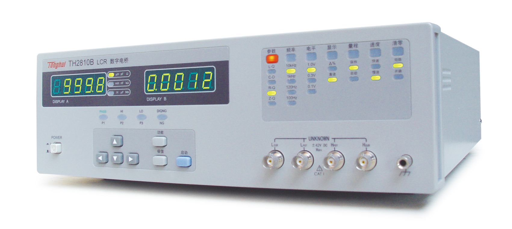 ■?數(shù)字電橋 TH2810B型LCR數(shù)字電橋是一種測試速度快、精度高、測試范圍寬的通用阻抗測量儀器。 四個測試頻率點,最高至10kHz, 30Ω 、100Ω兩種不同信號源輸出阻抗可使儀器測量結果與眾多LCR結果相一致,同時也能適應陶瓷電容器對測量電平的要求。?