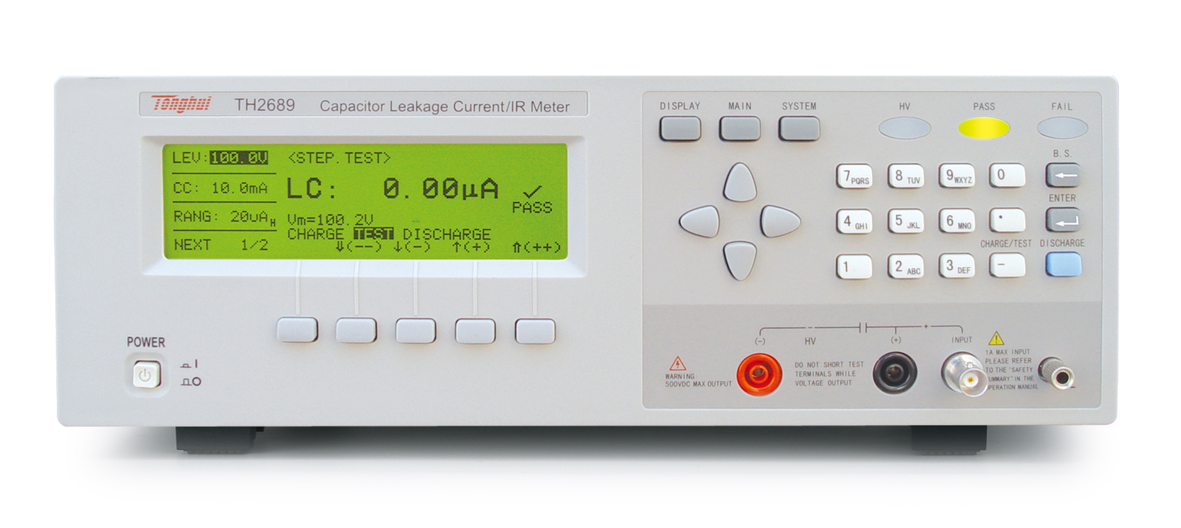 ■?TH2689型電容器漏電流/絕緣電阻測試儀分別提供最大測試電壓:800V,充電電流0.5mA~500mA(>100V時由最大輸出功率50W限制)。主要應用于電解電容/陶瓷電容等漏電流,絕緣電阻及鋁電解電容陽極箔耐壓測試。也可應用突波吸收器,齊納二極管,氖燈管等動作電壓確認和漏電流測試。標配了RS232、Handler接口,可選購的GPIB接口,以及穩定快速的測量,使TH2689不僅可以應用于進貨檢驗,更可應用于自動化生產測試等等。
