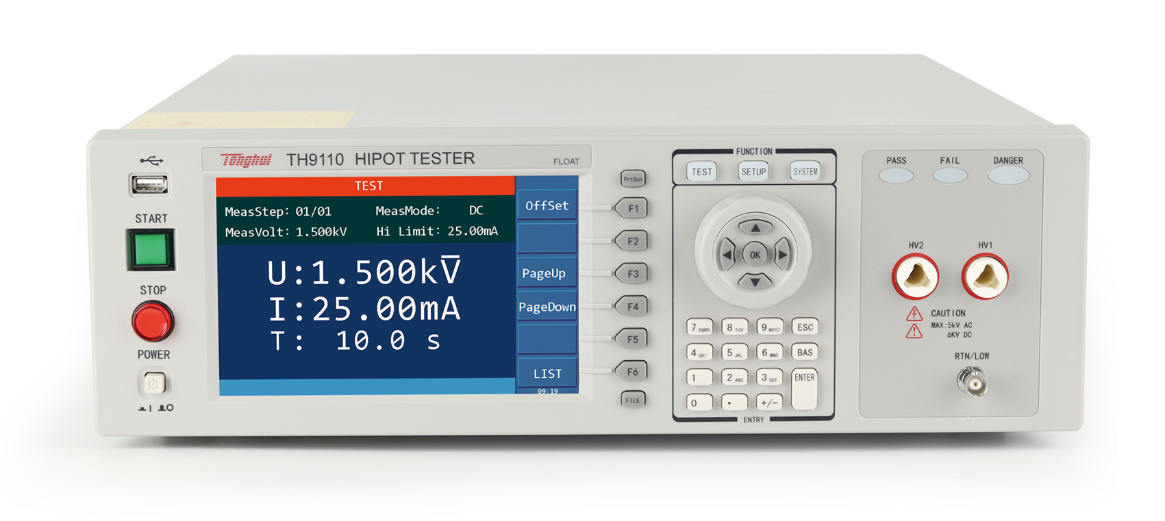 ■?TH9110/TH9110A是集同惠多年電氣安規測試儀的設計經驗,新推出的具有500VA功率,最大輸出交流5kV/100mA的新一代交直流耐壓/絕緣電阻測試儀,符合大功率耐壓測試需求,符合EN50191的設備安全標準。TH9110/TH9110A系列除了基本的交流、直流、絕緣電阻測試外,增加了崩潰電壓測試功能,可分析產品的擊穿點電壓,滿足特定客戶對產品高壓可靠性檢測的要求; 具有開短路檢測功能,解決了用戶在測試安規產品時的可靠性和準確性問題,輸出時同步進行接觸檢查,避免漏檢,提升測試可靠度與效率。TH9110/TH9110A使用7寸LCD彩色顯示器,測試結果用大字符顯示,更加清晰直觀,方便操作與判斷。高壓浮動輸出設計、觸電保護功能等,確保了客戶在接觸到高壓測試端的時候也不會被電擊傷害,保證操作人員的人身安全。