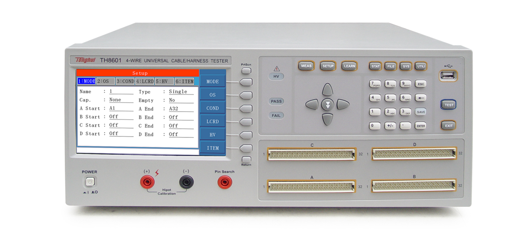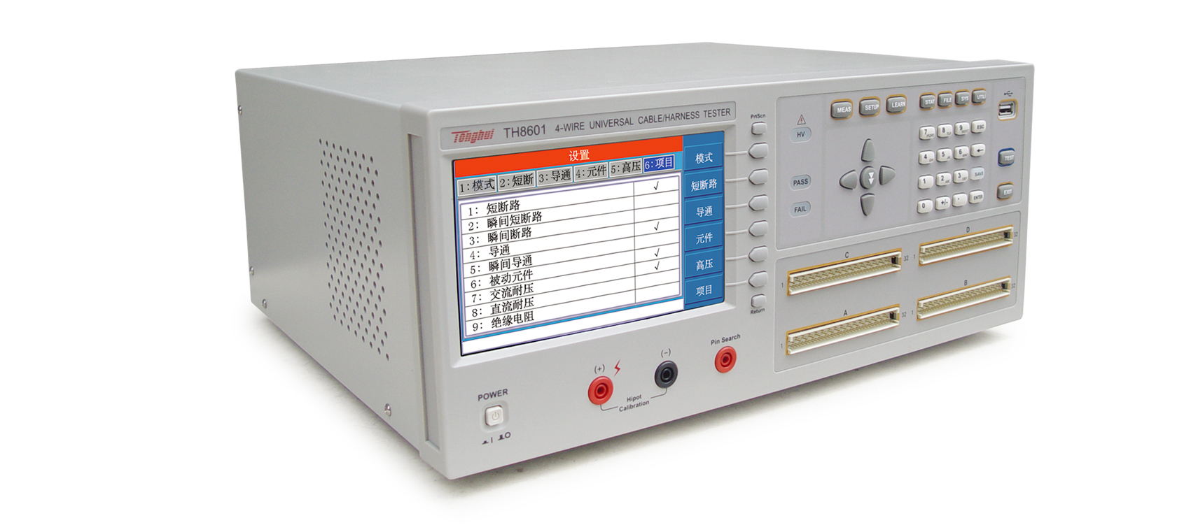 TH8601 線材綜合測試儀簡介■?TH8601系列四端線材綜合測試儀是專用于各種線纜,線束和排 線品質(zhì)及連接可靠性檢驗的多功能,自動化的線材綜合參數(shù)測試 系統(tǒng)。該系統(tǒng)提供可編程的恒流恒壓源以及高壓源,測試項目涵蓋了導(dǎo)通,被動元件(電感,電阻,電容,二極管),交直流耐壓,絕緣電阻各種高低壓參數(shù)。本系統(tǒng)采用先進(jìn)的LCR數(shù)字采樣及高速長壽命通道切換技術(shù),大大提高了測試精度,速度以及使用壽命。采用高低壓