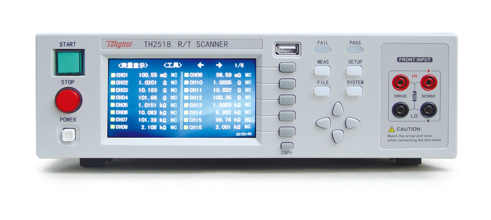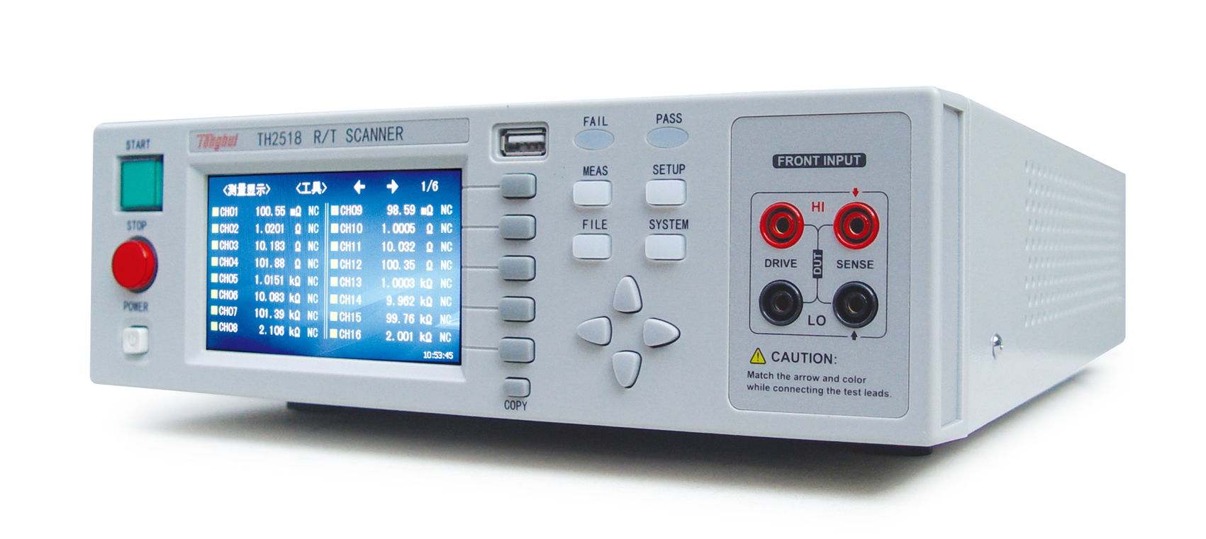 ■ 同惠TH2518系列電阻/溫度掃描儀模擬測試掃描單元采用同步插卡式的設計理念,可支持的插卡板測試單元可達6個,且在插卡板之間實現同步測量,大大提高掃描測量速度。每塊測量板內包含16個測試端,測試端的組合支持用戶可自由編程,最高可配置高達90路電阻/溫度掃描測量通道,每通道測量可單獨設計分選比較邊界以及輸出比較分選信號。溫度測量的采樣方式可配置為PT500鉑電阻、PT100鉑電阻、模擬電壓輸入三種方式以適用不同的應用場合。0.05%的最高電阻精度,在200mΩ量程下,電阻分辨率更是達到了10uΩ的水準,測試掃描范圍從10uΩ到200kΩ。儀器的溫度補償和溫度轉換功能使產品的測試免除環境溫度的影響,可輸出整機級、板級以及各通道的比較分選結果,使您的測試和數據分析處理、產品的分揀工作更加輕松。標配的RS232、USB HOST、USB Device和HANDLER接口既方便您測量數據的快速保存,又方便您遠程的掌控儀器。帶觸摸功能的24位色、分辨率為480×272的彩色液晶屏,給您的測量操作帶來不一樣的感覺!