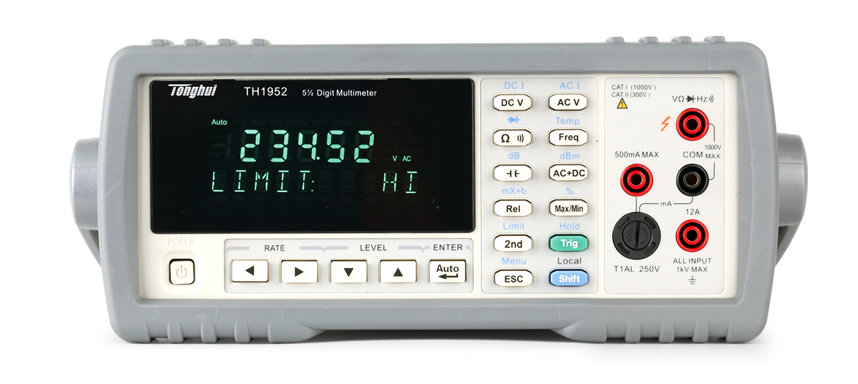 TH1952 五位半數(shù)字多用表簡介■ TH1952型5 1/2 位真有效值數(shù)字多用表是一種多功能、物美價廉的電壓/電流/電阻/電容測試儀。儀器提供120000字的最大讀數(shù),200次/秒最大ADC采樣速度,0.02%的直流電壓準(zhǔn)確度等一系列優(yōu)良的性能和經(jīng)濟(jì)的價格為廣大客戶提供最優(yōu)的選擇。TH1952提供高亮度VFD雙參數(shù)顯示器,可以同時測量/顯示交流/直流電壓或者電流、交流電壓/電流和頻率等參數(shù),不